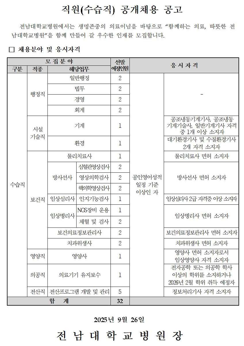 fnctId=bbs,fnctNo=2091 글번호 935888 전남대학교병원 채용공고(의공직/전산직) 작성일 2025.09.30 수정일 2025.09.30 작성자 관리자 조회수 120 첨부파일 입사지원서및자기소개서(참고용).hwp 미리보기 ncs직무기술서(수습직).zip 2025년 직원(수습직) 공개채용 공고.hwp 미리보기